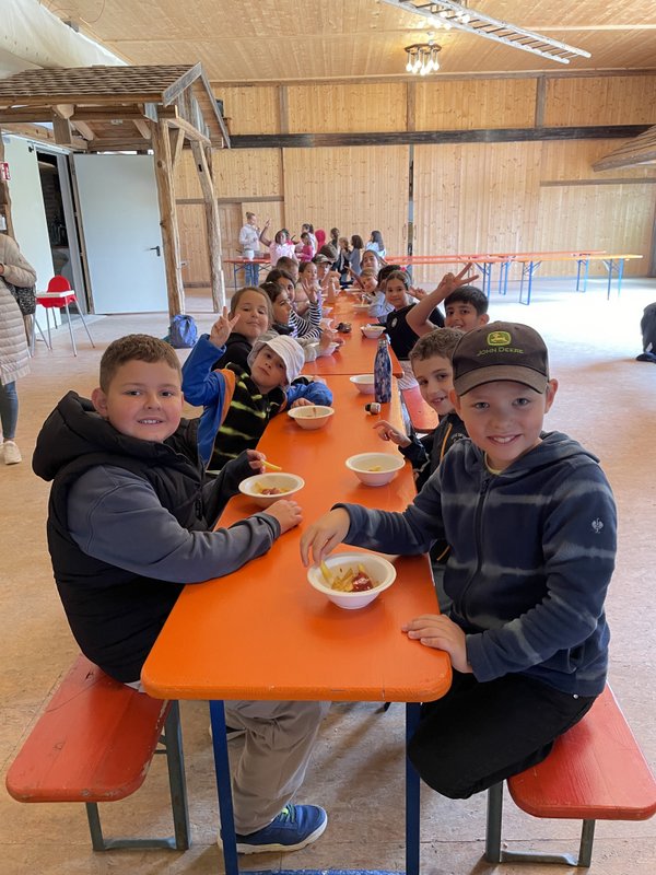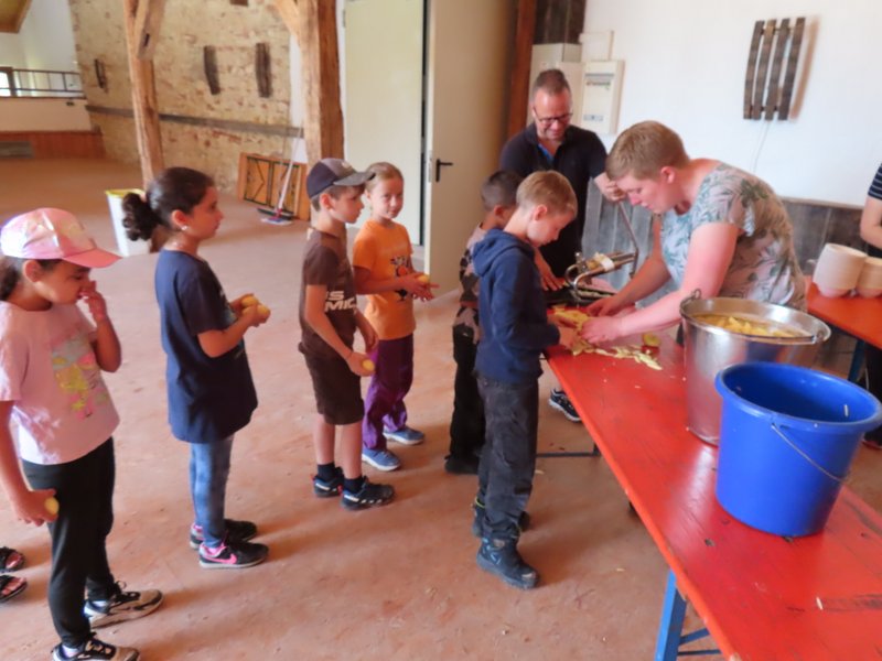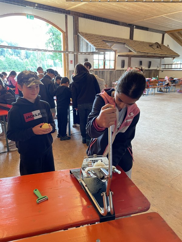 Anschließend haben die Kartoffeln gewaschen, geschält und in Pommes-Stückchen geschnitten. Während unseres Hofrundgangs mit wurden diese in der Küche frittiert. So durften wir sie schließlich zum Abschluss mit Ketchup verzehren. Lecker, lecker!!
