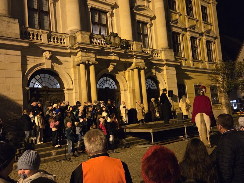 Der Höhepunkt des Abends ist das traditionelle Martinsspiel. Diese Aufführung erinnert uns an die zeitlosen Werte des Heiligen Martin: Menschlichkeit, Mut und die Bereitschaft zu teilen. Ergreifend wird die Szene der Mantelteilung dargestellt, wenn der Heilige Martin auf einem weißen Schimmel erscheint und als Soldat seinen Mantel mit dem Bettler teilt – ein starkes Zeichen der Nächstenliebe.