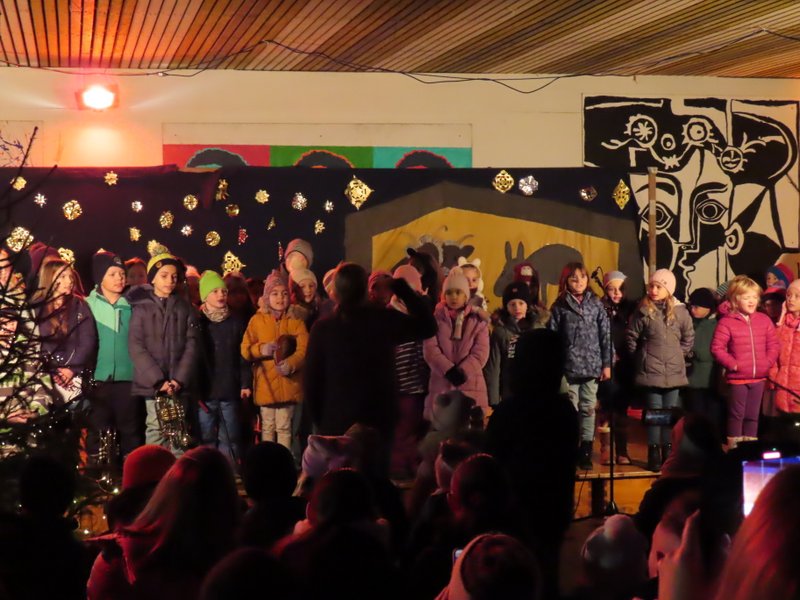 Der Schulchor 3/4 verzauberte das Publikum anschließend mit dem Klassiker „Schneeflöckchen, Weißröckchen“. Auch die Klassen 1/2a und 1/2c präsentierten mit ihrer Musiklehrerin Uschi Schwarzmann das Lied „Draußen unterm Himmelszelt“ mit großer Freude und begleiteten sich selbst auf Orff-Instrumenten.